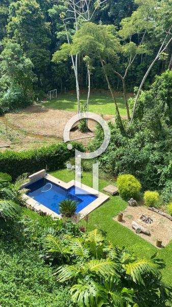 - Área externa com muito verde, piscina, chuveirão e espaço com mico